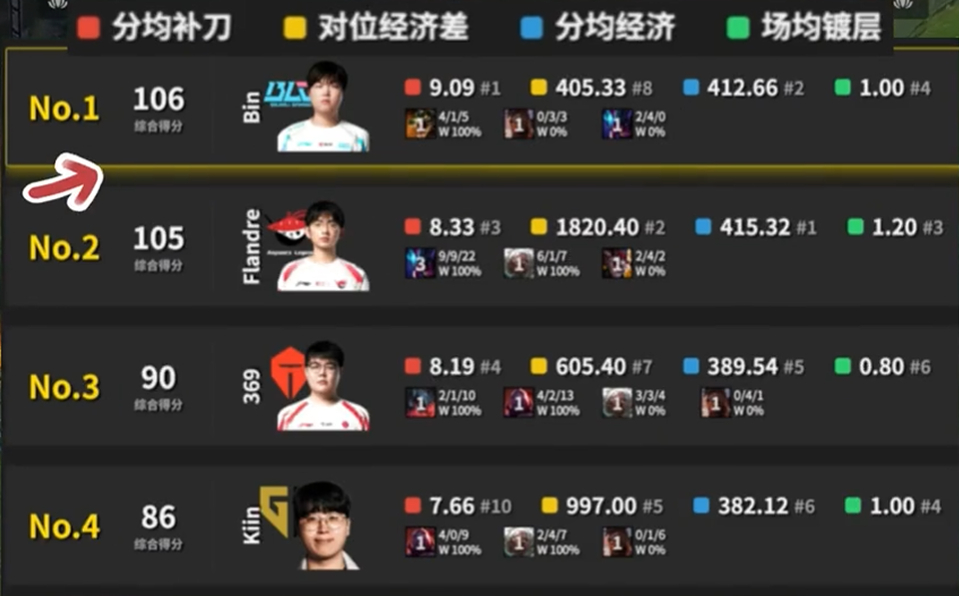 不过,Bin 哥在刷经济方面倒是“一枝独秀”。分均补刀排名第一,分均经济排名第二。这本应是优势,但结合前面的数据来看,却成了讽刺。他拿着最多的经济,却既无法打出足够的输出,也不能有效承伤,就连KDA也难以保障,不禁让人质疑:Bin哥到底把钱花在了哪里?