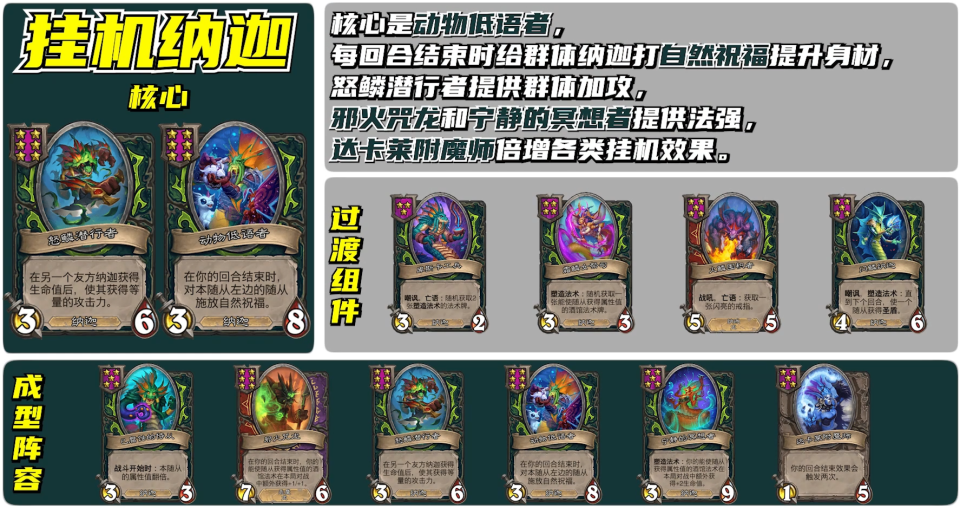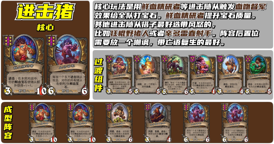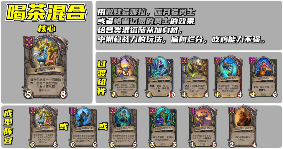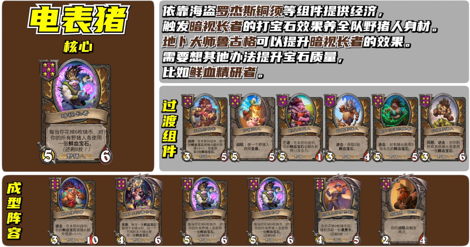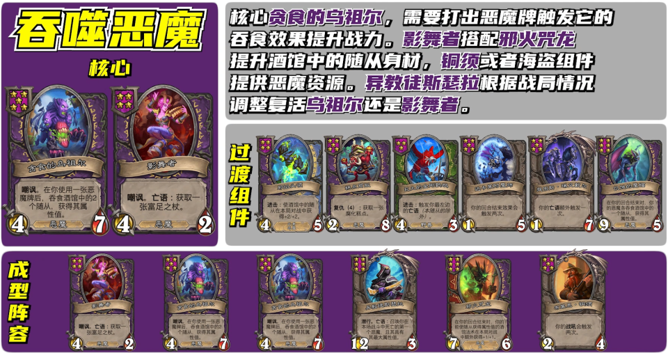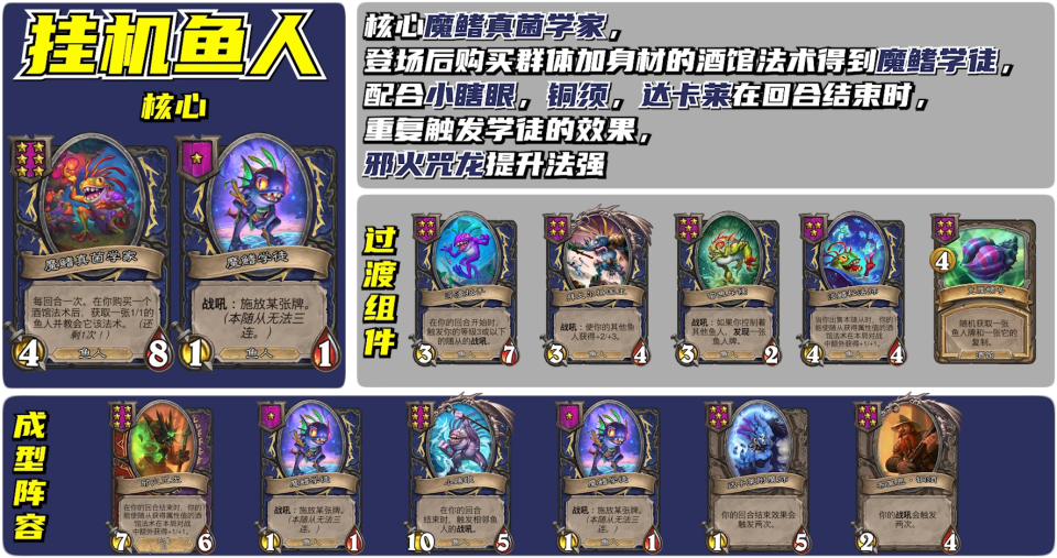 目前环境中最强的两大流派分别是挂机鱼人和炸弹恶魔。挂机鱼人核心魔鳍真菌学家,登场后购买群体加身材的酒馆法术得到魔鳍学徒,配合小瞎眼,铜须,达卡莱在回合结束时重复触发学徒的效果,邪火咒龙提升法强。炸弹恶魔核心沉默的惩罚者,配合陆行鸟、 瑞文在战斗开始时触发它的群体伤害,同时触发废墟领主的群体身材增长,斯瑟拉复活惩罚者。可以挂一个泰蕾苟萨保存废墟领主的增长效果。海盗主要是电表倒转流,核心牌罗杰斯,骄傲的私掠者和铜须。组件够多可以实现无限资源,通常会养1-2个狂战,也需要各种加法强的牌增强悬赏令效果。纯海盗阵容的身材增长效率不高,因此电表海盗通常会搭配其他流派的组件形成混搭流,例如搭配破碎主母的电表纳迦实现群体加血,搭配龙体系养大魅惑之翼进行传血,搭配暗视长者和鲁古格形成电表猪,搭配救赎者娜拉或者噬月者的勇士形成中立法茶或者奇茶,搭配贪食的乌祖尔形成吞食恶魔流。野兽主要有3种。进击野兽上限比较高但是成型比较困难。核心重踏剑龙和护巢机。剑龙给全体野兽加上进击效果,中间的魔刃豹,机械木马等野兽提供亡语频率,触发后置位护巢机的复仇效果进行攻击。第2种是钻地虫亡语流。需要在中前期给钻地虫叠复仇增强它的亡语效果,亡语效果够高了以后,用鹦鹉,陆行鸟和瑞文触发它的群体BUFF能力。第3种是巨狼亡语流。玩法类似钻地虫,但狼爹不需要养,成型快一些但上限要比钻地虫低,可以作为阵容过渡的流派。同样是用鹦鹉,陆行鸟,瑞文触发巨狼戈德林亡语的群体BUFF。鹦鹉+陆行鸟+瑞文这亡语三件套除了配合本家野兽,还能配合其他流派的亡语随从。比如前文提过的炸弹恶魔。还能配合海盗的舰长尤朵拉,配合纳迦的显眼的骑手形成亡语纳迦,配合亡灵的遗骸看管者和古墓捣蛋鬼形成亡灵挤爆流。纳迦目前可玩的阵容有4套。一套是刚提到的亡语纳迦,核心显眼的骑手,亡语可以给全体纳迦加身材,但需要打法术养他的亡语效果,阵容上限不算高。更常见的是法术纳迦流,核心破碎主母和怒鳞潜行者。打法术触发破碎主母的群体加血,怒鳞潜行者给群体纳迦加攻击。已腐蚀的侍从让身材收益加倍。铜须和库斯卡工兵提供法术资源,资源也可以混搭罗杰斯等海盗牌提供。沙锤蓝调也是纳迦的常见玩法,搜尽量多的热情沙锤手和深沉蓝调歌手提高蓝调的法术效果。前期可以用熔岩潜伏者保存蓝调的效果,后期可以用雪崩召唤者每回合养一个随从后吃给雪崩。挂机纳迦的核心是动物低语者,每回合结束时给群体纳迦打自然祝福提升身材,怒鳞潜行者提供群体加攻,邪火咒龙和宁静的冥想者提供法强,达卡莱附魔师倍增各类挂机效果。鱼人最强的流派是视频开头提过的挂机鱼流派。除此之外还可以玩手牌鱼,用鱼人蟊贼和铜须配合养大手牌里的裁脍鱼人,战斗中用低音提琴鱼人拉上场提供战力,合唱鱼人从手牌中的裁脍鱼人获得身材。原始鱼人画家可以给场上的鱼人提供身材。鱼人还可以组下毒阵容。核心怒胆喷毒鱼人,本身具有烈毒效果并且给别的鱼人上毒,低音提琴鱼人提供鱼人频率。阵容还可以搭配棘化荆蔓女巫,火车王,刺脊刺击者等牌。通常用于针对缺乏亡语圣盾频率的大哥阵容。龙类的玩法主要是传血流。核心是要想办法养大魅惑之翼的身材,通过他的进击效果给其他龙类传递血量。执念诗心龙用于保存魅惑之翼的身材加成。纳迦怒鳞潜行者可以把魅惑之翼传给火麟囤积者和各类融合怪的加血效果也加上攻击力。养大魅惑之翼的途径包括卡雷苟斯,火铸唤魔师,海盗罗杰斯或者铜须等。恶魔的最强阵容就是前文提到过的炸弹恶魔,除此之外也可以玩吞食流,核心是贪食的乌祖尔,需要打出恶魔牌触发它的吞食效果提升战力。影舞者搭配邪火咒龙提升酒馆中的随从身材,铜须或者海盗组件提供恶魔资源。异教徒斯瑟拉根据战局情况调整复活乌祖尔还是影舞者。元素目前有3种玩法。前两种比较传统,首先是经典的诺米流,用诺米和攀藤元素养大购买下来的元素,利用三连或者雪崩召唤者转化战力。诺米流也可以配合刚才提到的吞食恶魔流提升乌祖尔的吞食效果。第2种是极紫外倒转流,核心极紫外升腾者,刷元素随从提升它的身材加持效果,和诺米一样比较依赖铜须给的经济。第3种是这个版本的新套路。现境大师沙石流。沙石幼龙会根据回合内的出牌量重复身材加成效果,触发现境大师的增长效果。雏龙走私商和达卡莱可以翻倍沙石的触发次数。要注意雏龙走私商不用合金的,2个普通的效果大于1个金的。没拿到现境大师的话不建议硬玩。野猪人有4种套路,首先是前面提过的电表猪。依靠海盗罗杰斯铜须等组件提供经济,触发暗视长者的打宝石效果养全队野猪人身材。地卜大师鲁古格可以提升暗视长者的效果。需要想其他办法提升宝石质量,比如鲜血精研者。第2种更为常见,进击野猪人,核心玩法是用鲜血精研者等进击随从触发血吻督军效果给全队打宝石。鲜血精研者提升宝石质量。其他进击随从搭子最好选带风怒的,比如狂棍野猪人或者辛多雷直射手。阵容后置位需要放一个嘲讽,带亡语复生的最好。第3种是手牌猪。核心热气球测绘员,他配合地卜大师鲁古格可以翻倍手牌中打出的鲜血宝石效果。鲜血宝石可以由宝石切分者和野猪预言家提供。同样还需要其他办
