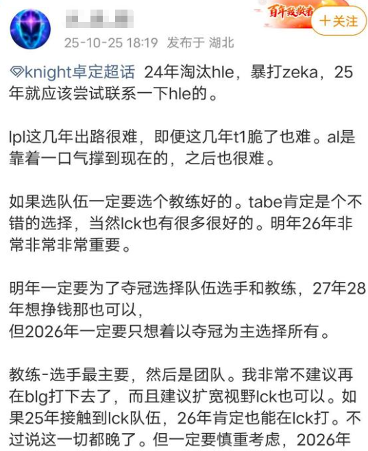 Knight作为LPL第一即战力,在转会期可以随心所欲挑队伍,关键还是看哪支队伍有充足的预算,能组一支争冠级别队伍,如23年的JDG和24年的BLG。总之,BLG今年虽然拿到了LPL年度冠军(不是优胜者),但风评骤降,世界赛16强出局,绝不算成功的一年。上单Bin,下路Elk+On是建队基石,应该不会换;打野必换;中单Knight可能也会换(主要是钱够不够留住),让我们看看接下来会发生什么。