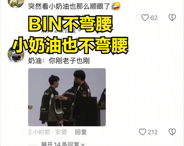 TES除了淘汰BLG让观众们高兴之外,TES中单小奶油跟BIN互不弯腰的行为,也是收获大量观众的喜爱,不少观众认为小奶油很硬气。BIN不尊重TES选手,那么小奶油也不需要尊重BIN,甚至不少观众认为,未来LPL选手可以学一下小奶油,遇见BIN这种不喜欢弯腰的,也不弯腰跟BIN握手。(今年决赛小奶油就已经不服BIN了,小奶油跟BLG其他选手都弯腰,就是不跟BIN弯腰)