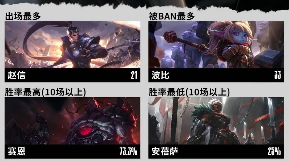除了赛程调整之外,拳头还在近日,分享了瑞士轮的选手、战队、英雄数据,咱们一起来看看,本次瑞士轮,赵信是出场次数最多的英雄,一共登场21次,波比的禁用率,反超沙皇登顶,一共被禁用33次,登场10次以上,胜率最高的英雄是老司机(73.3%),狼母的胜率最低,只有25%。