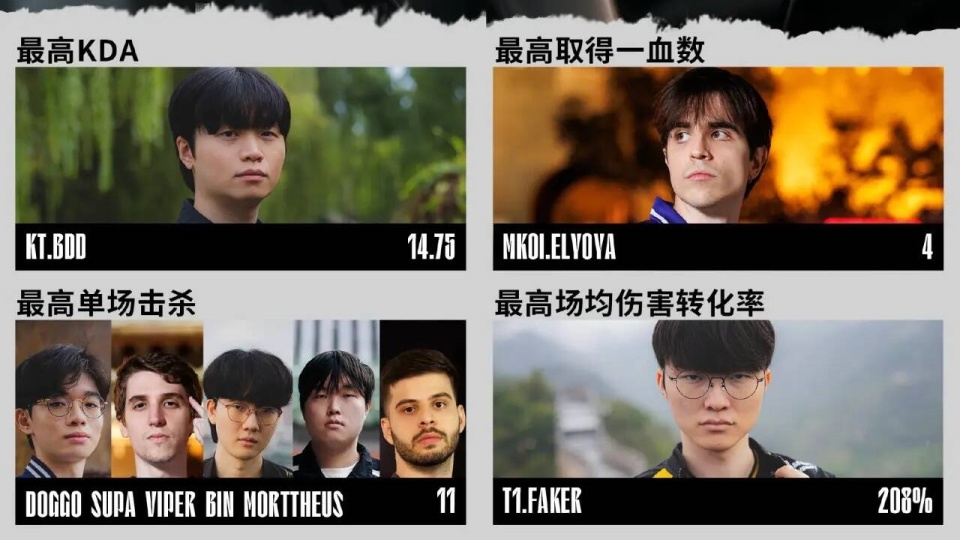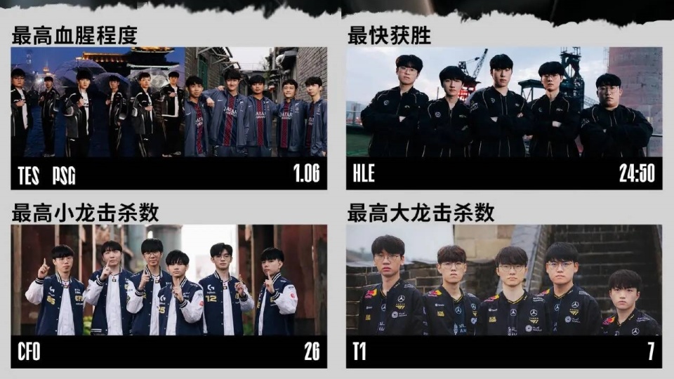 战队数据方面,滔搏和PSG的血腥程度最高,HLE打100T时,只用了24分50秒就赢下比赛,刷新了本届瑞士轮获胜时长,另外小龙控制率最高的队伍是CFO,他们一共控了26条小龙,而大龙控制率最高的是T1,一共拿到了7条大龙,最后是总击杀数最高的队伍,MKOI以145杀登顶。