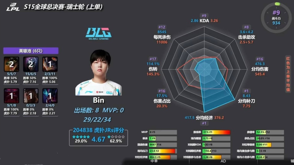 这次瑞士轮的单杀王,是MKOI下路玩VN的Supa,他一共单杀过6次,左手和Bwipo都是4次,并列第二,在中单和上单位置,排在第一,真正的世一上Zeus,分均伤害、伤害占比、击杀助攻,都是上单位第一,对比之下,Bin哥就有点尴尬了,分均补刀、推线率第一,伤转、占比倒数。