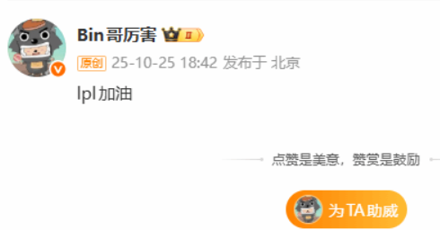 LPL的粉丝们虽然遗憾,但更多的是尊重,每一个站上世界赛舞台的选手,都承载着无数努力与牺牲,输赢只是一时,信念与热爱才是电竞的底色,正如Bin所说:“LPL加油!” 这不仅是他对同赛区战队的鼓励,也像是在对自己、对未来发出新的宣言——他不会止步于失败,而会在下一个赛季,带着新的斗志重新起航,对此你们有什么想说的吗?