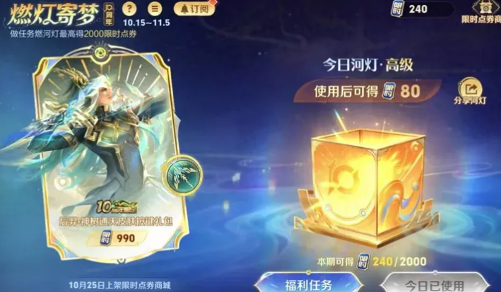 另外,十周年的福利活动也不少,后羿的神树通天免费拿,这样的福利,错过就要等十年啊,限定皮肤免费送,大手笔,各位千万别错过了。与此同时,只要我们每天使用高级河灯就能获得80限时点券,分享河灯或者使用好友河灯,再加上每日登录游戏每日对局,累计就能获得最高2000限时点券了,最后再加上25号赠送的1000限时点券,就能存够3000限时点券了,这个够玩家们用了。
