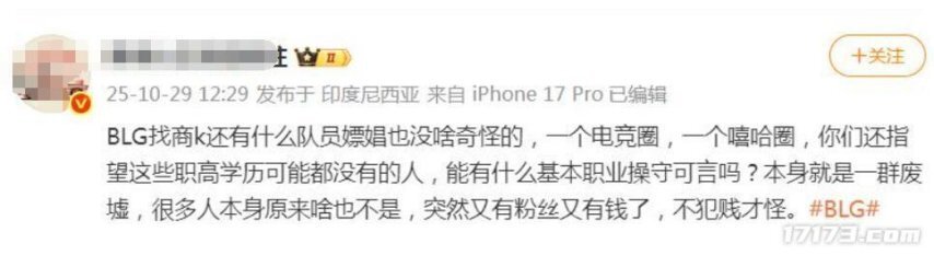 有网友就吐槽,说韩国LCK赛区选手Peanut被淘汰后痛哭流涕,反省自责,BLG这样的行为严重缺乏职业精神。还有大V直言,职高学历都未必有的选手突然暴富,缺乏职业操守是必然。