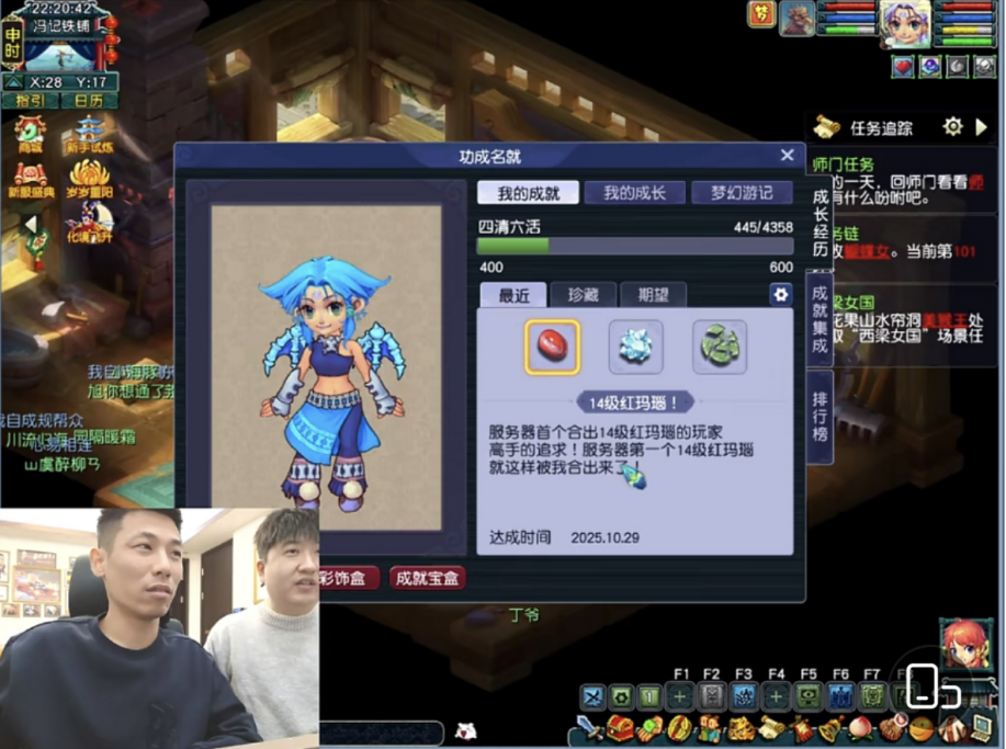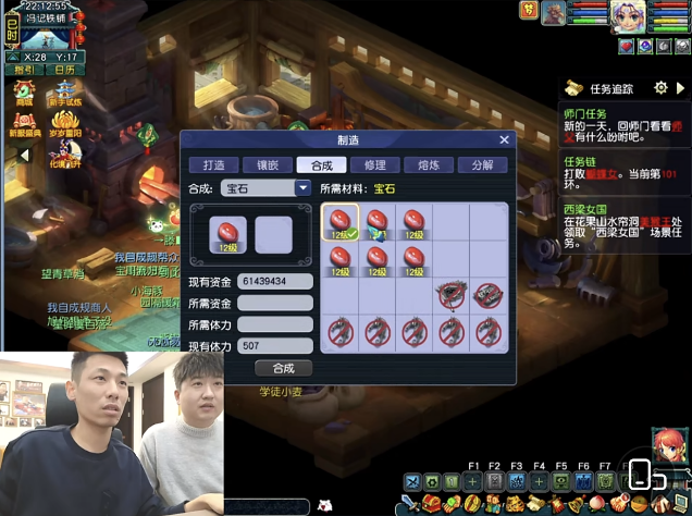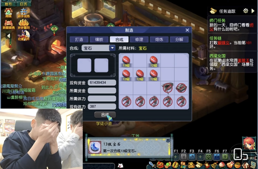 然后宝哥又用剩下的两个13级的宝石,最终合出来服务器第一个14级的红玛瑙,但是宝哥忘记了宝石要一级一级往上打,还差一个13级的才可以上到14级,就让老王抓紧在他下播之前再弄一个13级的!