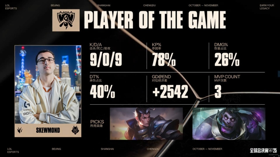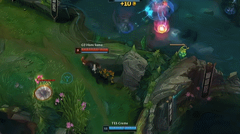 14分钟TES抓住关键机会,Crème先手卢锡安后预判E位置大招一套输出后再进场击杀巴德,卢锡安爆死拿下双杀,随后以人数优势中断G2节奏,拿下先锋。