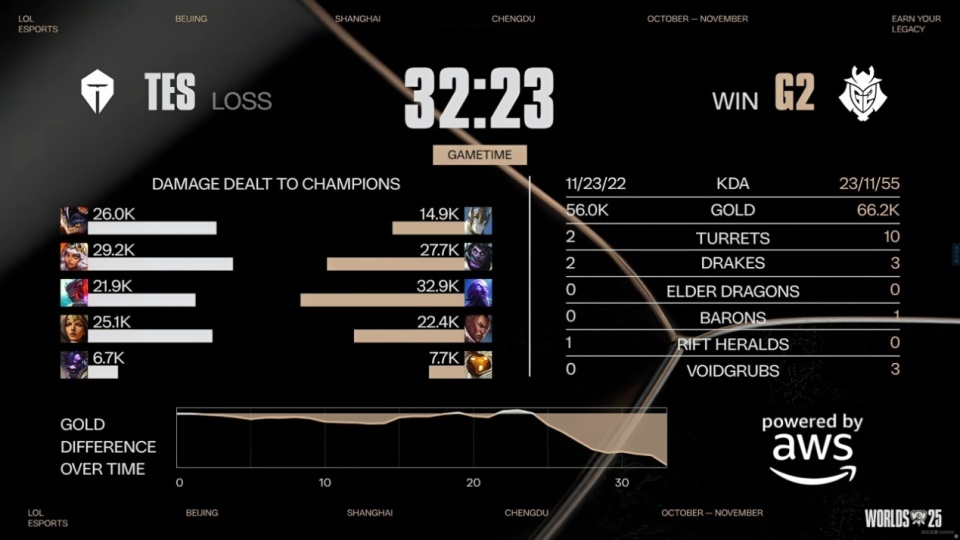 重新整补之后G2再次进攻上路,TES尝试开团失败,中路永恩进场未能切死C位后自己没能回到原位直接阵亡,G2一波进攻留人后顺势赢团一波结束比赛。