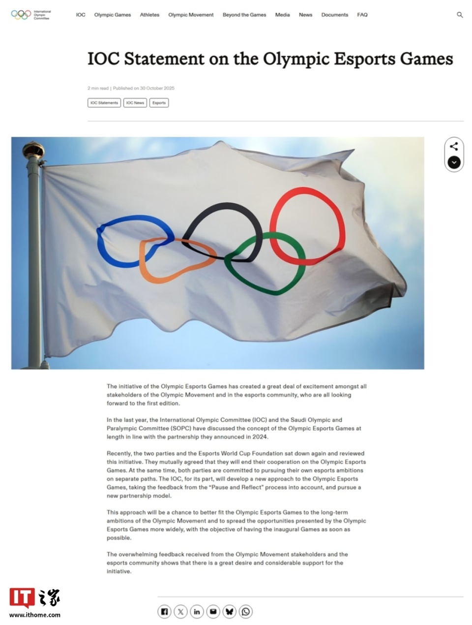 IT之家 10 月 30 日消息,国际奥委会发布关于奥运会电子竞技比赛的声明,终止和沙特电竞基金会合作,双方将各自独立推进电竞领域的发展计划,并探索全新的奥运赛制发展方案,但未明确提出首届电竞奥运会举办时间。声明原文及翻译如下: