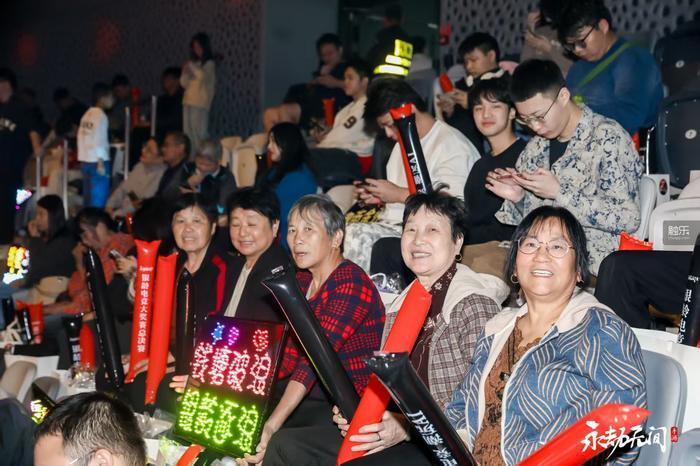 观看比赛的过程中,我注意到观众席上同样有很多老年人,他们会和年轻人一样,拿起应援牌,为自己支持的战队和选手激烈地加油打气。尤其是坐在我身旁的几位——他们真的很懂比赛,会讨论选手们的表现,还会调侃比赛画面中实时显示的选手心率,“你看他,都飙到160啦!”