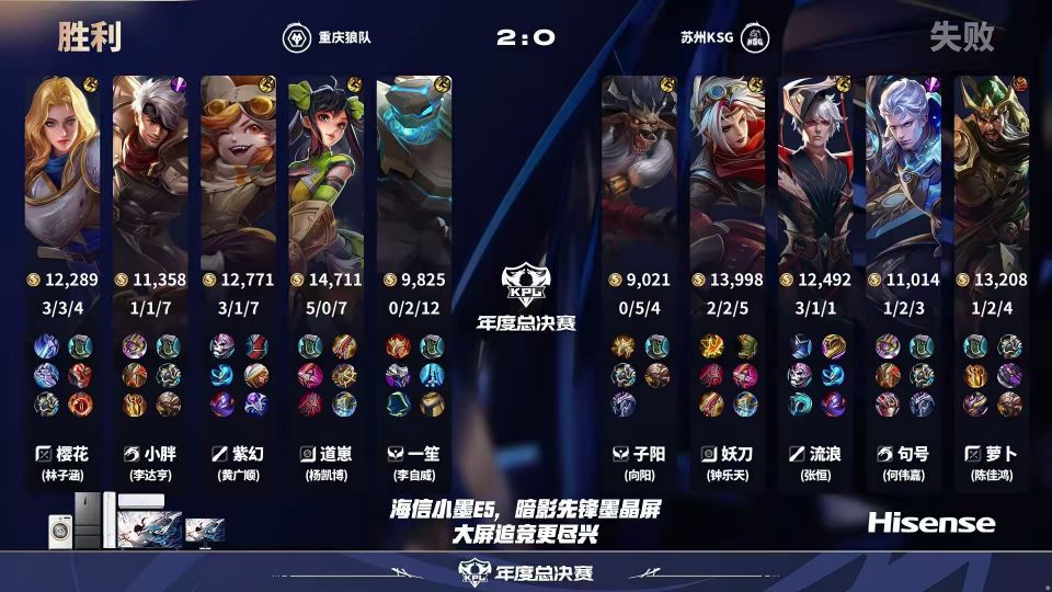 最后一波团战还是关羽开起来的,鲁班闪现拉开,火舞进场就被回顶了。句号的镜进场强切守约,道崽一丝血本来能走,但A了一下被反甲反死了,这也是道崽五局以来死的唯一一次。在KSG仅剩三人的情况下,萝卜开船绕了一圈还想开团,但鲁班父子完全跟不上。最后只剩下子阳和妖刀,狼队四人强行越塔打出团灭,最终4-1拿下比赛。
