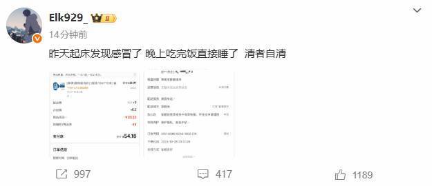 对此,BLG的AD选手Elk在之后发文澄清:“昨天起床发现感冒了,晚上吃完饭直接睡了,清者自清。”并附上了买药的订单截图。