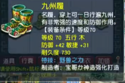 70级的鞋子,防御+42,敏捷+29,特效是流云诀!
