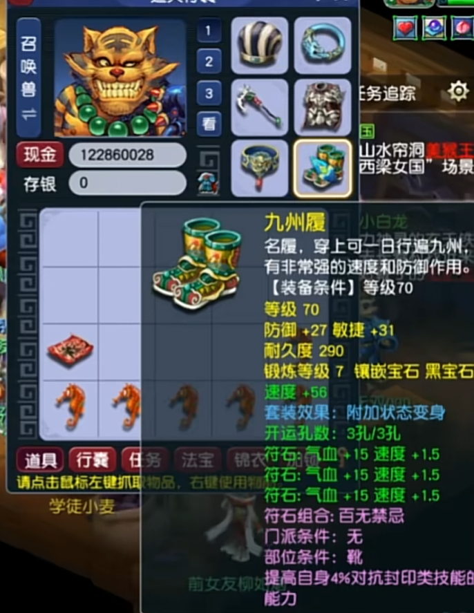70级的变身鞋子,防御+27,敏捷+31,这个鞋子是给无级别腰带让路无奈只能带普通70级变身鞋子了,而且宝哥在已经自己鉴定出70级的变身鞋子的时候,因为比这个鞋子少两点敏捷,又多花了4亿多珍宝阁秒的!
