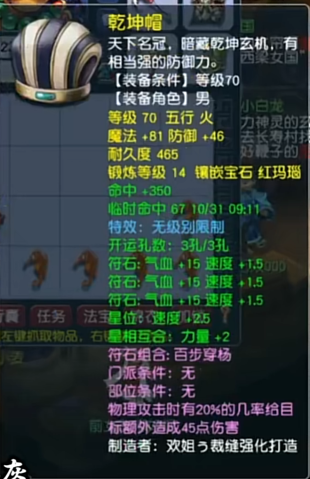 第二件应该是全服第一的70级男头了,魔法+81,防御+46,特效是无级别限制,打了14段红玛瑙,从1段宝石上到14段宝石,相当于一级15段宝石的成本,12级的红玛瑙基本上就要小一万了,这个男头的花费真的非常高!