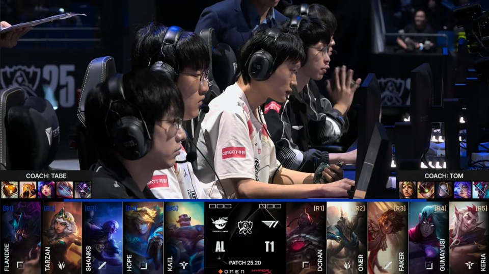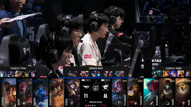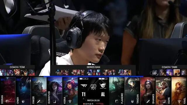 第一局比赛,AL蓝色方,禁用:巴德;沙皇;妮蔻;波比;牛头,选用:Flandre雷克赛;Tarzan奇亚娜;Shanks瑞兹;Hope伊泽瑞尔;Kael布隆;T1红色方,禁用:巨魔;芸阿娜;发条;炸弹人;希维尔,选用:Doran塞恩;Oner潘森;Faker岩雀;Gumayusi韦鲁斯;Keria洛
