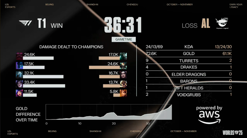 结果第一局比赛,双方各打了半场好局,T1笑到了最后。前15分钟,AL领先1000的经济优势。但是16分钟左右,Doran塞恩吸收大量伤害,T1团战控制链拉满完成2换4;18分钟左右,Flandre雷克赛突然杀出,AL众人一拥而上击杀Faker;21分钟左右,AL下路双人组率先被秒,Tarzan关键大招AL及时止损;27分钟左右,T1完美团战阵型,逐个击破完成团灭随后拿下龙魂与大龙;29分钟左右,T1巨大优势推进,Gumayusi火龙魂韦鲁斯轻松拿下双杀;最终36分01秒,T1团灭AL,先赢一局。