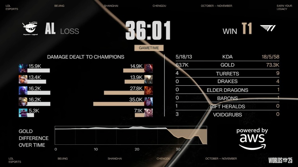 S15全球总决赛八强赛T1和AL的BO5,双方打满5局之后,AL以2-3的战绩不敌T1,止步8强!