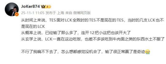 不论如何,包括前LPL解说Joker在内的一批LOL老玩家,都觉得TES能在BO5赢T1的可能性基本为零,除非老天出奇迹,又或者T1成员水土不服,吃了牛肉面+小杨生煎拉肚子,导致发挥失常。