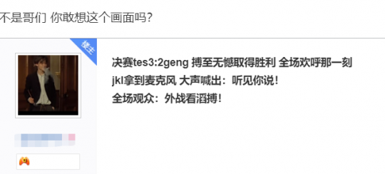 当然,如果TES真的能拿下T1且一路夺冠的话,也会创造全S赛史上最大爆冷名场面,压根不敢想,jkl拿到麦克风 大声喊出“听见你说”,然后全场观众齐声呐喊“外战看滔搏”的场面。
