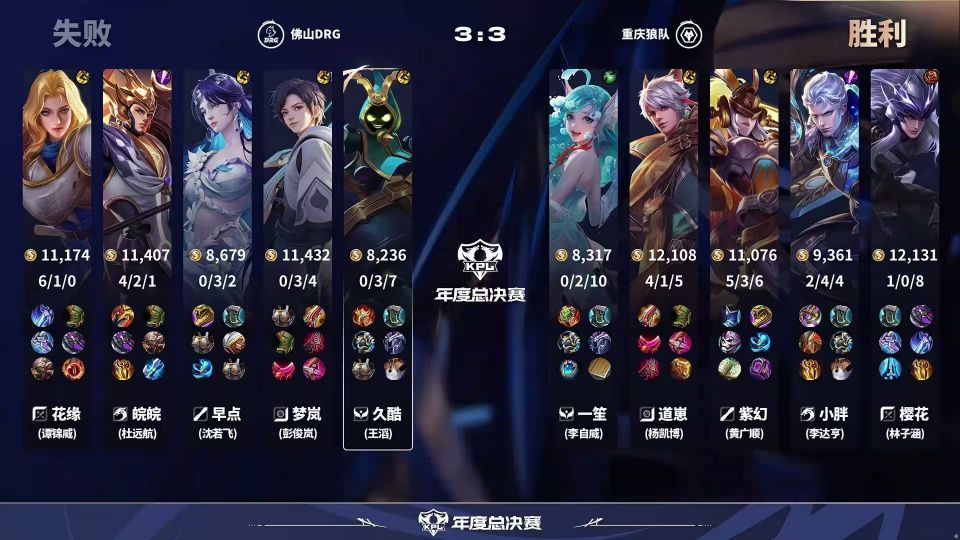 最后DRG只剩三人,狄仁杰又是大闪命中鲁班,盾曹进场击杀梦岚。狼队五人带着三路兵线直推水晶,4-3拿下比赛。