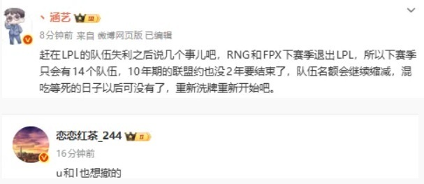 同时LPL赛区的体量也会缩小,涵艺在微博上面就爆出猛料,RNG和FPX两大冠军队伍将会退出联盟,而红茶也透露说很多队伍都想要退出联盟,包含U和L开头的队伍,应该是UP和LNG。