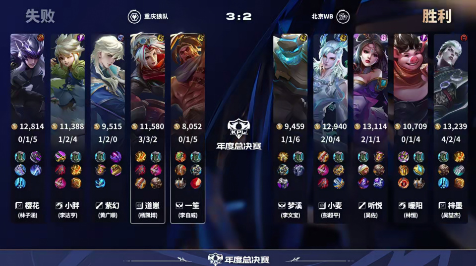 风暴龙王双方决战,暖阳大司命顶在前面,但是没有进入神巫状态,没能斩掉樱花,小胖想进来抢龙被孙尚香击杀。乱战之中小麦拿到了风暴龙王。本以为WB要赢了,但道崽的艾琳输出位置特别好,根本没人能威胁到他,先杀大司命再杀太乙。小麦复活站起来被沈梦溪控了一手,孙尚香阵亡之后道崽彻底无敌,再杀残血的曹操和嫦娥,一波四杀收尾终结比赛。道崽也是激动得手拍桌子了,这种比赛赢下来,士气上确实是极大的提升。