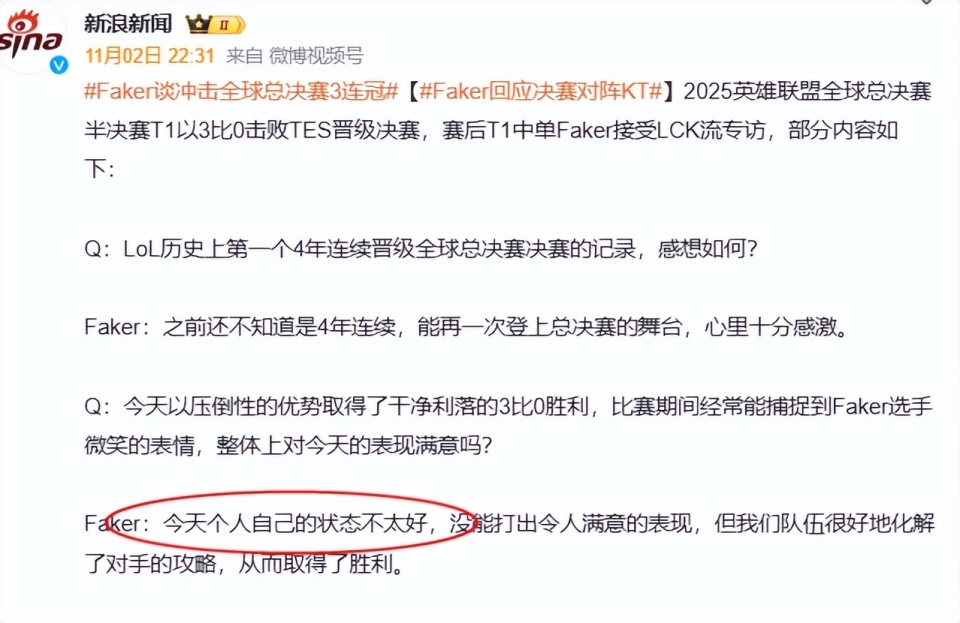 赛后Faker谈到TES,还直接一句话杀人诛心了,表示自己状态不是很好。话说,不是很好都零封TES了,而且是碾压,要是状态好呢,不是比打小兵都简单?