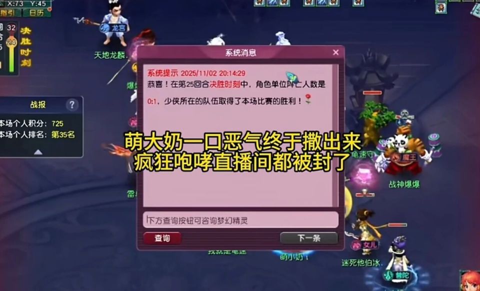 昨天开始的时候萌大奶就一直在找宝哥的队伍,秦风下坐骑、下称谓、下锦衣就为了躲萌大奶,而且不断偷摸刷分,还去嘲讽别人,人家萌大奶也给宝哥刷过礼物,而且也是陈伯的大哥,这种人你作为一个指挥竟然还要嘲讽人家,真是自己给自己带节奏。最后萌大奶赢的那一刻积累了一晚上的郁闷都释放了在哪里疯狂喷秦风,最终直播间被封禁,本来没事的,都是老板,输赢大不了我下次更新把场子找回来,这下子就变成节奏了!