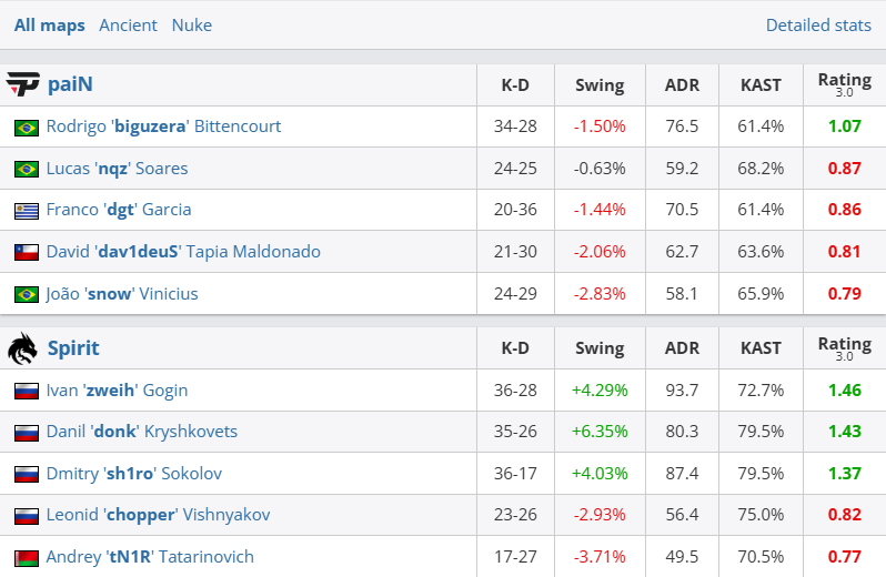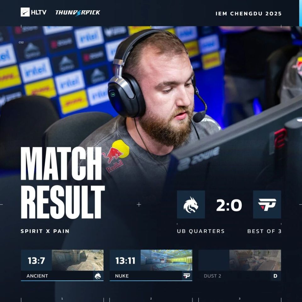 图一Ancient,作为传统遗迹高手的Spirit并没有给paiN太多的机会,donk和sh1ro双子星发挥顺利先下一城。图二paiN虽然开局很顺,但来到下半场的Spirit也找回了自己的状态连续追分,尤其zweih后程发力连续取得关键破点击杀,绿龙最后还是成功以13-11翻盘拿下首胜。