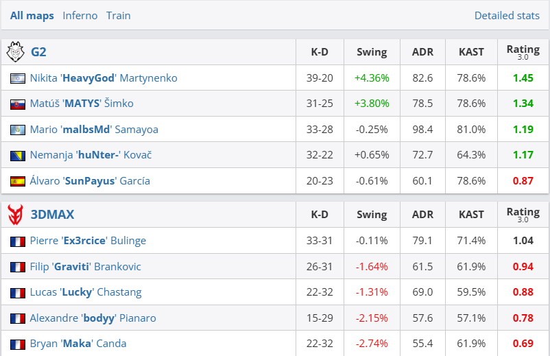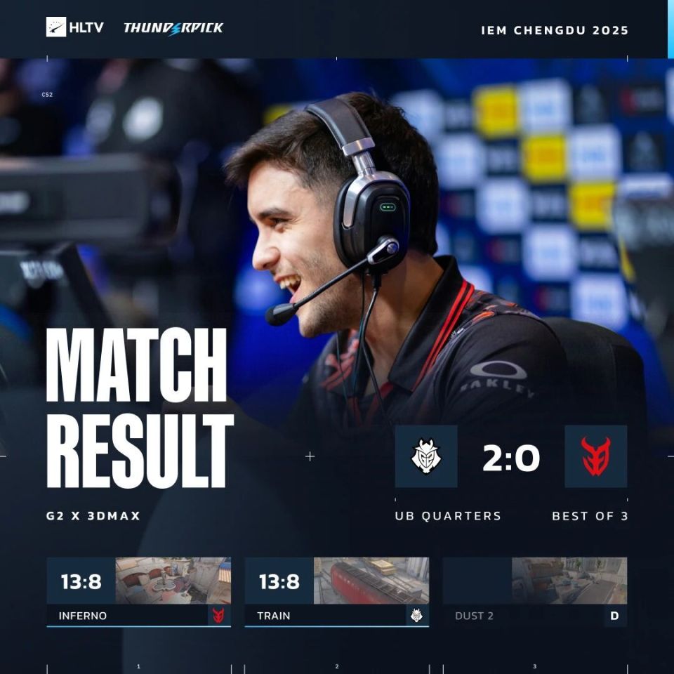 图一Inferno,G2一上来就火力全开,打的3DMAX毫无招架之力,上半场直接送给对面一个11-1的暴打,虽然下半场3DMAX尝试追分,但奈何分差太大,还是输掉了自己的选图。来到图二Train,G2还是保持了上图的火热状态,又以同样的比分毫无悬念地轻松赢得比赛。