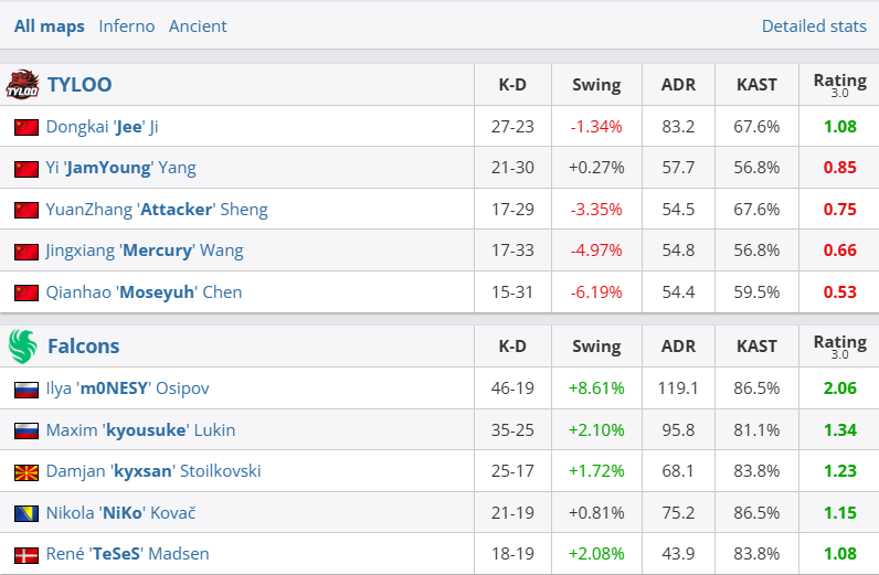 图二Ancient小孩4杀赢下手枪局,猎鹰一上来便攻势如潮,TYLOO溃不成军0-8开局。Jee完成1V2后终于守下第1分,半场追至3-9。换边小孩再度手枪局4杀,猎鹰无懈可击轻松终结比赛。