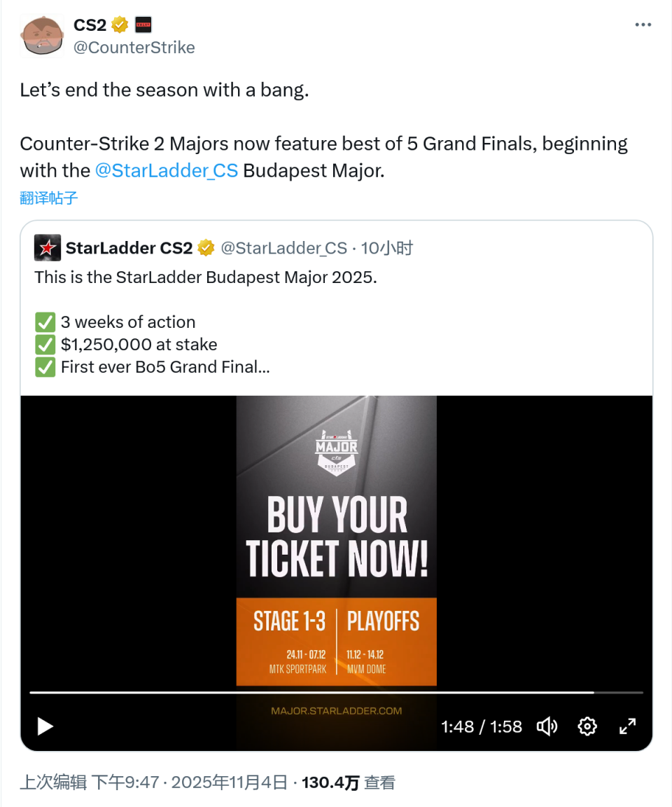 IT之家 11 月 5 日消息,Valve《CS2》官方昨日正式确认,自今年 11~12 月举行的 StarLadder 布达佩斯 Major 起,所有《CS2》Major 的总决赛将从此前的 BO3(三图二胜)赛制改为 BO5 赛制。