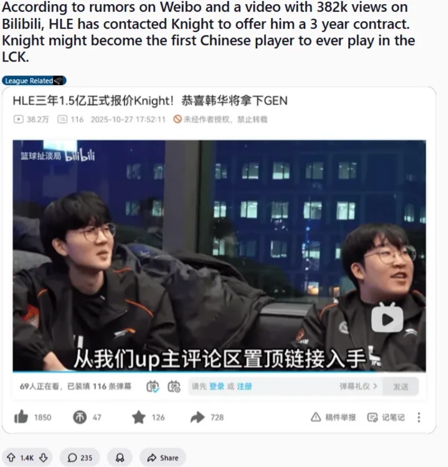 最有趣的是很多LPL观众也支持这样的交易出现,想要看看在LPL烂成这样的情况下,Knight去LCK赛区会发生什么事。
