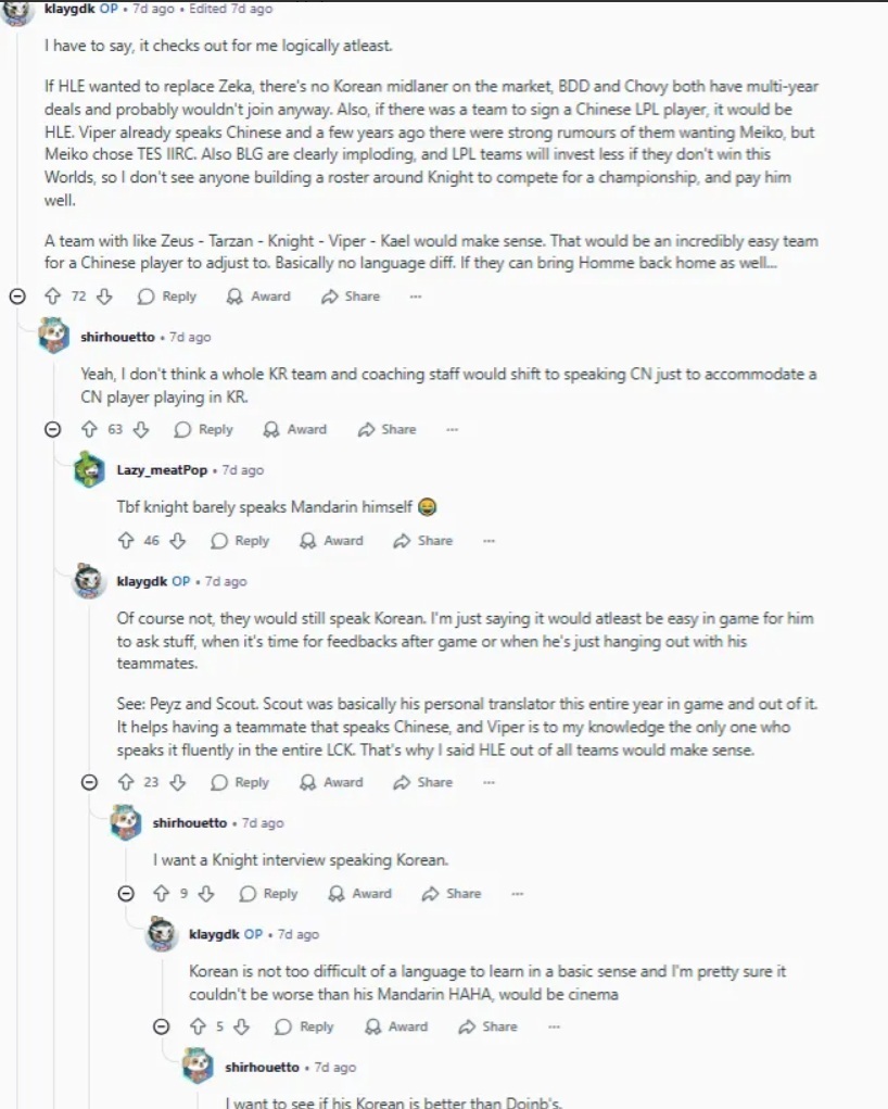 大家都对这笔转会表示认同,觉得HLE确实可以选择给Knight一份报价,让Knight来LCK赛区效力,这样可以创造新的历史,同时HLE也可以完成关键性的补强。