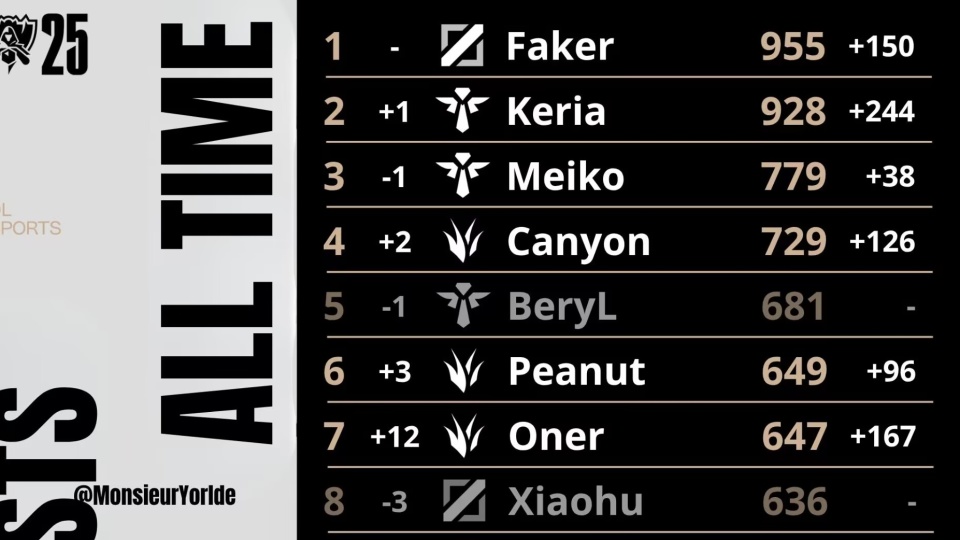 LOL世界赛决赛,再有2天就开打了,外媒在近日,重新统计了全球总决赛助攻榜,排在第一位的,依旧是Faker,他距离1000助攻,只差45个了,如果决赛血腥程度比较高的话,老李今年就能破千,排在第二的Keria,跟李哥的差距很小,他今年刷了244个助攻,决赛也有可能会破千。