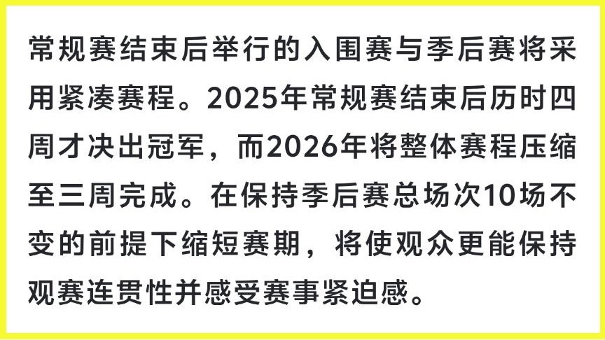 在保证季后赛总场次,10场不变的前提下,取消入围赛双败赛制,传奇组第五名,和崛起组第一名直接对决,胜者晋级季后赛,崛起组2-3名较量过后,胜者再跟上一轮,传奇和崛起中的败者竞争季后赛名额,另外抛硬币选边取消,入围赛改为:排名较高的队伍优先选边,季后赛也一样。