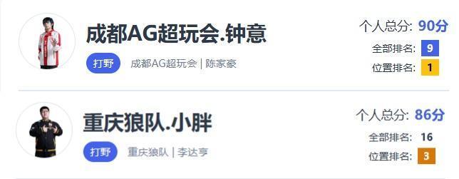 根据KPL实时战力系统给出的评分来看,AG战队钟意选手总分90,位居排行榜第一,而重庆狼队打野选手小胖总分86,排在第三位,从评分的角度来说,钟意确实是当前联赛第一野,而他得分之所以高,是因为在局内的表现非常之亮眼,数据也是十分华丽。