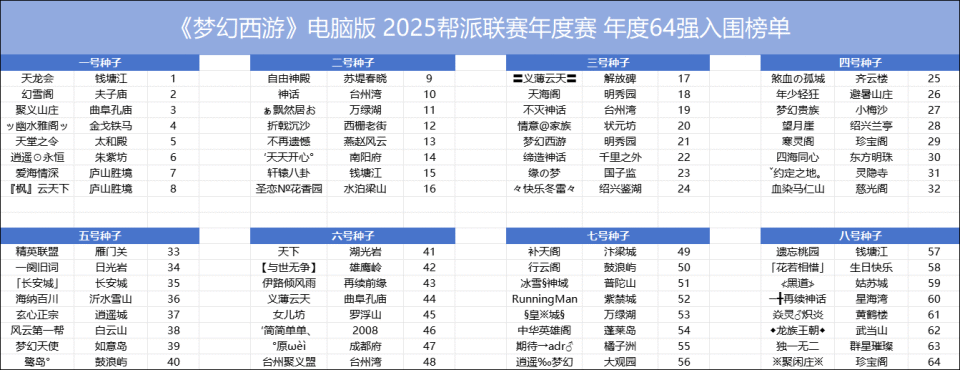 2025帮派联赛年度总决赛现已火爆开启!经过一整年的激烈角逐,共有64个帮派成功入围。本届赛制也迎来全新升级,分组规则参考了足球赛事的抽签方式,共设8个种子池。