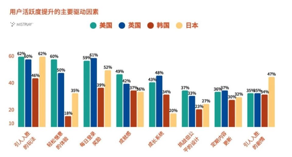 这一点能够更加明显地体现在日韩英美玩家维持活跃以及进行内购的动机原因上,例如对于美国玩家来说,维持活跃的最重要原因是有吸引力的玩法和轻松的游戏体验(超过60%的玩家选择了这两个原因),但对日本玩家来说,明显有更多人是出于“故事剧情精彩”,而维持活跃。