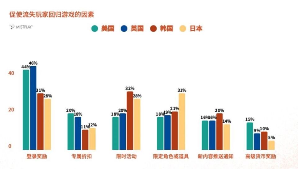 内购付费动机方面,日本和韩国玩家在“获得新角色”这一点上的比重,都要比欧美玩家更高;流失玩家回流原因,美国玩家和英国玩家有较高比例的人表示是出于登录奖励,而日韩玩家则更倾向于因为版本限定的新角色、物品、活动而回坑。