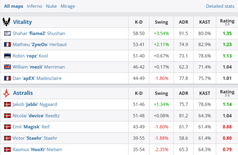 决胜图Mirage,A队赢下手枪局又被翻盘,长枪局jabbi和HooXi轮番输出,魔男双杀拿下残局,而薯薯则以英雄AK完成翻盘,半场双方打成平手。但来到下半场,大黄蜂的防守无懈可击,终局火仔与薯薯完成3V5回防,Vitality一波7-1铁血防守终结比赛。