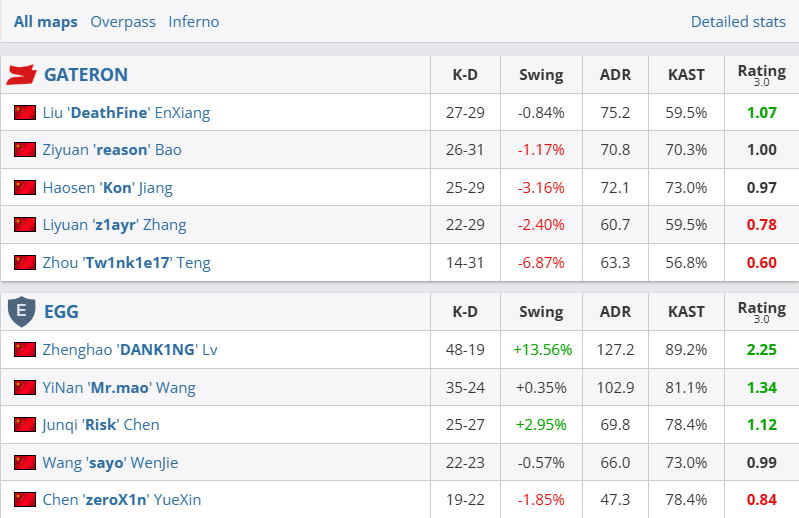 图二Inferno,EGG在0-3开局下守出一波7-2钢铁防守,DANK1NG手感依旧火热,Mr.mao也频频发威,EGG半场7-5领先。换边DANK1NG双杀拿下手枪局,而后又单局5杀灭队,单图再砍24杀助队伍一波6-1终结比赛。
