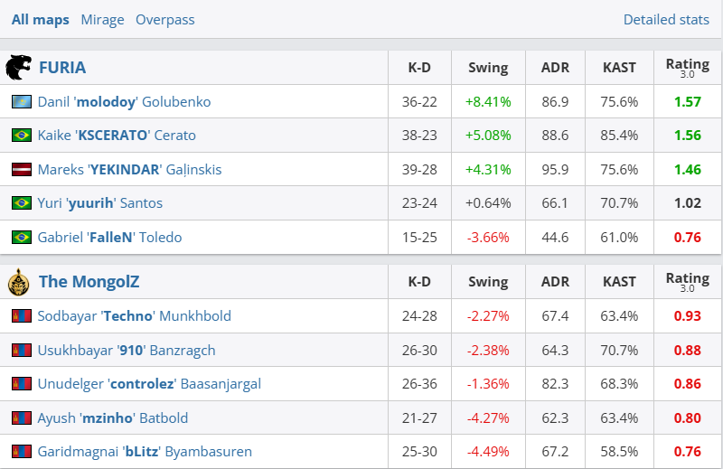 图二Overpass蒙古队拿下手枪局4-0开局,但自长枪局起狂哥和yuurih开始接管比赛,黑豹打出一波8-0进攻潮结束上半场。换边蒙古人再拿手枪局后双方你来我往,但随着molodoy的爆发,黑豹最终以3分优势终结比赛。