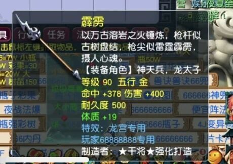 90级的枪,伤害+325,命中+350,体质+15,耐力-1,特技是水清诀。