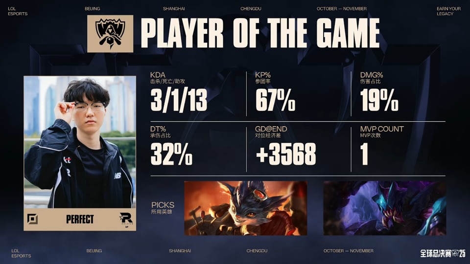 中期双方争夺小龙,Faker塞拉斯 开团虽然击杀Deokdam的EZ,但是KT上中辅收割打出2换5团灭T1。后期33分钟T1入侵野区,KT先抱团击杀Faker塞拉斯后,又在野区追死Keria璐璐,随后KT拿下第一条大龙。37分钟双方野区混战,Doran赛恩开团,Peter妮蔻反手R三人,KT打出2换2后,拿下炼金龙魂。40分钟Doran赛恩野区开团失误,自己被秒,KT拿下第三条大龙。最终42分钟KT在高地团灭T1后,拿下第二局的胜利。MVP给到了PerfecT的挖掘机。