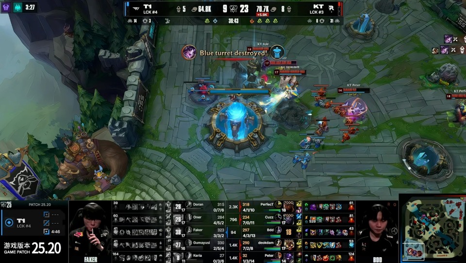 中期20分钟KT主动打厄塔汗,PerfecT铁男R到gumayusi滑板鞋,但是自己被击杀,T1拿下厄塔汗。23分钟双方争夺小龙,T1冲散KT的阵型,Faker酒桶完美拉扯,Doran酒桶拿下水龙魂,Gumayusi滑板鞋收割,T1团灭KT。25分钟PerfecT铁男R到Faker凤凰,但是自己被击杀,T1主动打大龙,KT想要阻止,T1直接开团击杀KT三人后,拿下第一条大龙。最终29分钟BDD蛇女R三人,但是伤害不足,Gumayusi滑板鞋豪取4杀,T1团灭KT后,拿下比赛的胜利。MVP给到了oner梦魇。