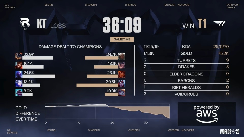 中期21分钟T1主动打厄塔汗,KT赶来阻止,为时已晚,T1拿下厄塔汗,KT追击上头被T1反打团灭。28分钟双方争夺小龙,T1全员冲脸开BDD小火龙,将其击杀后,T1打出1换4后,拿下第一条大龙,Gumayusi女枪打出7000的伤害。后期34分钟T1拿下风龙魂。36分钟双方野区混战,T1直接开团,BDD小火龙被秒,T1团灭KT后,拿下比赛的胜利。
