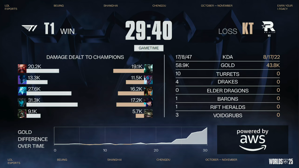 结果第一局比赛,两队各打了半场好局,T1笑到了最后。比赛前期,KT一度在上下路打开局面打出2k经济领先;比赛第18分钟左右,两队爆发小龙团。T1一波打出0换4大胜后反超经济;比赛第22分钟左右,两队爆发厄塔汗团。Doran进场帮助队伍打出0换2,后续T1一波再打出2换4后拿下厄塔汗;比赛第25分钟左右,两队爆发小龙团。T1一波打出1换3大胜拿到小龙;比赛第27分钟左右,KT集火掉Oner赵信后被T1包围,T1追击打出1换3后拿下大龙;最终比赛第36分09秒,Doran安蓓萨先手开到deokdam艾希,T1拿下大龙后打出0换3一波结束比赛。